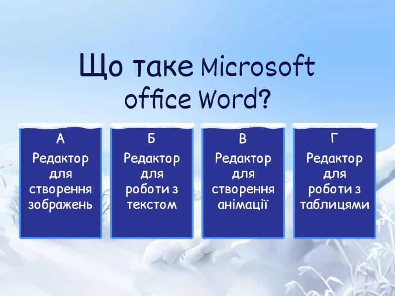 1) Що таке Microsoft office Word? a) Редактор для створення зображень b) Редактор для роботи з текстом c) Редактор для створення анімації d) Редактор для роботи з таблицями 2) Для створення електронних текстових документів та роботи з ними використовують спеціальні програми a) Текстові редактори b) Графічні редактори c) PowerPoint 3) Як позначається програма Microsoft Word a) b) c) d) 4) На яку позначку треба натиснути, щоб виділений текст був жирнішим ніж основний a) b) c) d) 5) На яку позначку треба натиснути, щоб виділений текст був курсивним a) b) c) d) 6) Яка позначка відповідає за колір букв у тексті a) b) c) d) 7) Комбінацією яких клавіш можна змінити мову? a) Ctrl+Shift b) Alt+Fn c) Shift+Alt 8) Яка клавіша відповідає за перехід на новий рядок a) Shift b) Ctrl c) Enter 9) Що можна зробити за допомогою цих інструментів a) змінити розмір сторінки b) зробити текст виділеним c) змінити назву шрифта та його розмір d) змінити мову друкування тексту