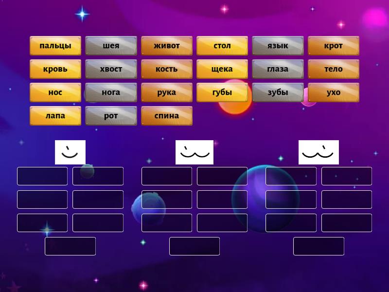 : кость, нос, крот, хвост, рот, кровь, стол, : лапа, ухо, зубы, губы, пальцы, шея, тело, : щека, глаза, рука, нога, спина, живот, язык,