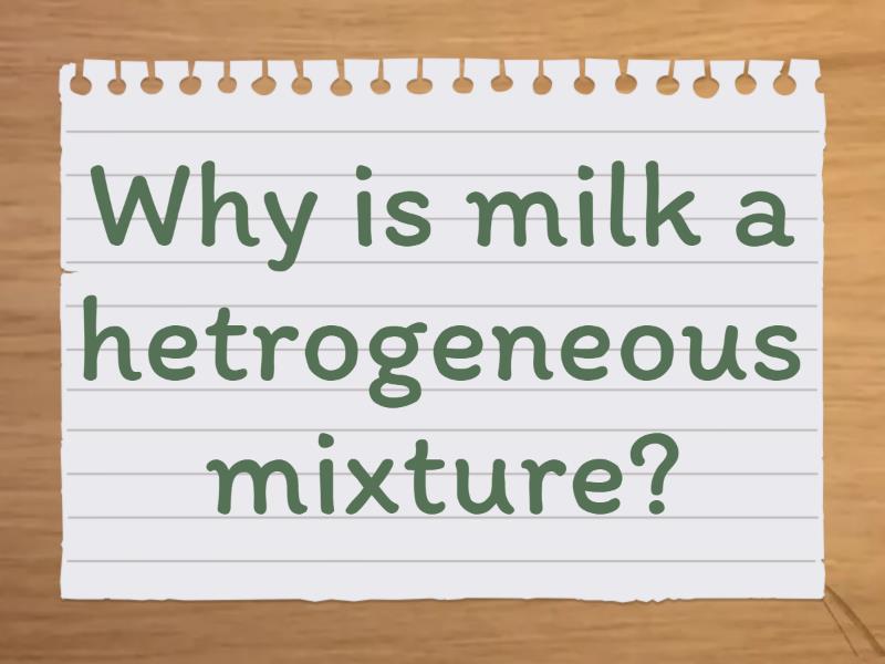 Sugar water - Solution, What type of mixture separates upon standing? - Suspension, A type of mixture where the particles are larger than those in a solution but not heavy enough to settle out. - Colloids, Which one is not an example of colloid - Salt water, Why is milk a hetrogeneous mixture? - It scatters light,