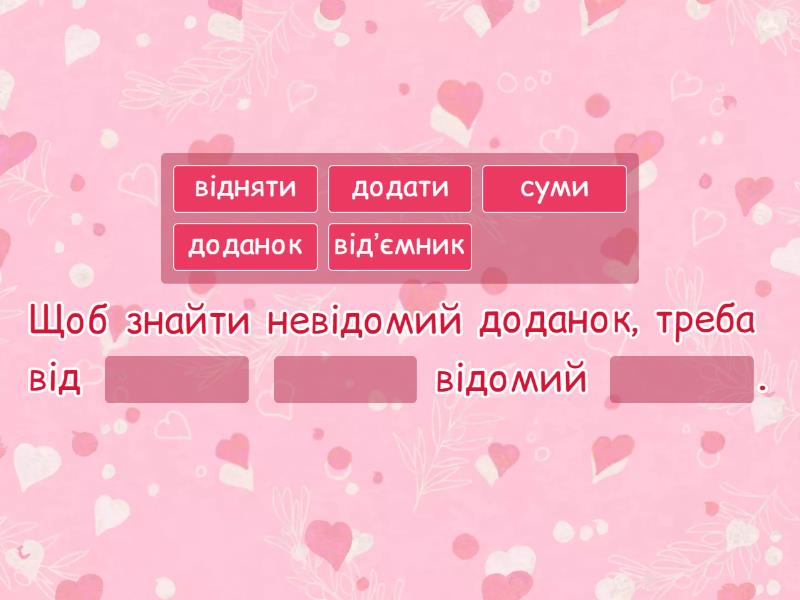 Щоб знайти невідомий доданок, треба від ____ ____ відомий ____. Щоб знайти невідомий від’ємник, треба від ____ ____ ____ Щоб знайти невідоме зменшуване, треба ____ ____ ____ ____.