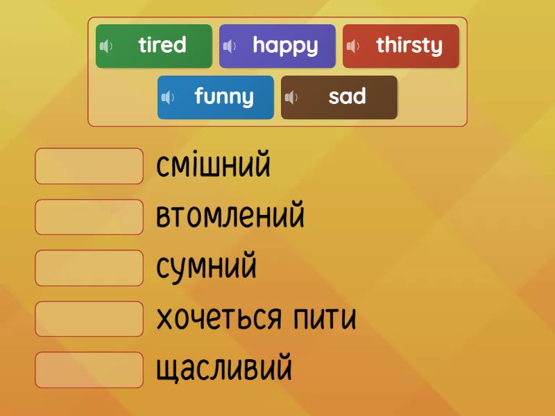 happy  - щасливий , funny  - смішний , tired  - втомлений , sad  - сумний , thirsty  - хочеться пити ,