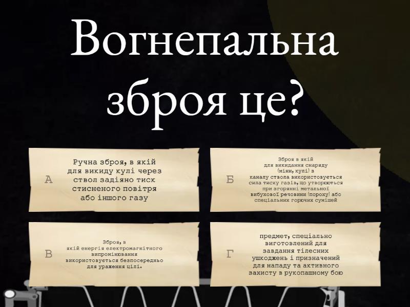 1) Вогнепальна зброя це? a) Ручна зброя, в якій для викиду кулі через ствол задіяно тиск стисненого повітря або іншого газу b) Зброя в якій для викидання снаряду (міни, кулі) з каналу ствола використовується сила тиску газів, що утворюються при згорянні метальної вибухової речовини (пороху) або спеціальних горючих сумішей c) Зброя, в якій енергія електромагнітного випромінювання використовується безпосередньо для ураження цілі. d) предмет, спеціально виготовлений для завдання тілесних ушкоджень і призначений для нападу та активного захисту в рукопашному бою 2) Виберіть правильні положення стоячи під час стрільби a) b) c) d) e) 3) Якщо стрілець з АК правша, де повинна знаходитись його ліва рука? a) На цівці, або ручці переносу вогню b) На газовій трубці зі ствольною накладкою c) Не важливо d) У визначеному стрільцем місці e) На стволі 4) Скільки існує положень при стрільбі з варіаціями, які є спільними для всіх військовослужбовців? a) Існує 3 положення b) Кількість положень невідома достеменно c) Існує 4 - 6 положень в залежності від роду військ d) Існує 12 положень 5) Найбільш стійким положенням для стрільби є ? a) Положення з коліна b) Положення стоячи c) Будь яке d) Положення лежачи e) Найбільш стійке положення не відокремлюють 6) Стабілізовану стрільбу відповідно до положення стрільця і центру ваги тіла розрізняють? a) Складна, середня, легка b) Висока, помірна, низька c) Сильна, середня, слабка d) Достатня, середня, незадовільна e) Не розрізняють 7) Виберіть положення стрільби у присідці a) b) c) d) e) 8) Чи необхідно при стрільбі приклад вкладати міцно в плече? a) Не звертають уваги b) Так необхідно c) Ні d) Не важливо e) Великої ролі не відіграє 9) Чи дозволяється направляти зброю на людей у випадках коли не відбувається вогневого контакту з ворогом? a) Дозволяється якщо зброя на запобіжнику b) Суворо заборонено c) Дозволяється, якщо відсутній патрон у патроннику d) Дозволяється, якщо зброя не заряджена e) Дозволяється, якщо заряджена запалювальними набоями 10) Виберіть положення при стрільбі лежачи з опорою a) b) c) d) e)