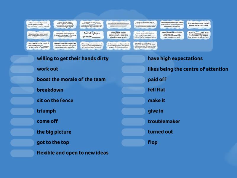 Я сейчас немного не по теме ielts и не по цели нашего общения с вами, но просто на ночь глядя зашла в ваш канал в телеге и глаз просто совершенно случайно зацепился за фразу что вопросы первой части ielts Speaking похожи на small Talk в психбольнице. Это, конечно, юмор и все такое, но я вам честно скажу, что врачи-психиатры такие вопросы не задают, их интересуют побочки на препараты, самочувствие и жалобы, а обычные пациенты, которые встретили в стаце людей, близких по духу и подружились, о таком вполне могут поговорить, впрочем, как и любые другие нормальные, психически здоровые люди, которые хотят лучше узнать интересного им человека. Я конечно понимаю что не мне вам указывать о чем писать в блоге, но российская психиатрия очень страдает от стигмы. И от этой же стигмы в первую очередь страдают сами пациенты, и очень сильно. Вас читают не один и не два человека, а 182, и такие вроде как мелочи в сми как раз и формируют по кирпичикам отношение общества к людям с нарушениями психики. Мало кто из них это неадекватные связанные овощи в слюнях из кино. У моей близкой подруги шизофрения, а у другой бар 1 типа, прл и диагностированная психопатия, и это только то, что я помню. Чудесные девочки и настоящие подруги. . It was risky, as there was a real possibility that the whole scheme would be a______. - flop, The number of fans shrank, there was a _________ in training schemes due to lack of money, and eventually the league folded in 1954. - breakdown, There was a lot of pressure, but the women couldn't_______ - they had to work hard to succeed. - give in, Unfortunately, things didn't ______ so well for the league in the 1950s, as it became more difficult for them to compete with the male league. - work out, Wrigley's gamble paid oft Women's baseball turned nut to be really popular, with one player, Dottie Kamenshek, appearing on a list of the top 100 female athletes of all time. - turned out , But Wrigley's gamble ______. - paid off, A men's team even tried to recruit Dottie, but that______ - she turned it down, as she thought it was just a publicity stunt. - fell flat, It was a ______, and in its best season the league had almost a million fans. - triumph, Some people think plans for a new league could_____ within the foreseeable future - come off, You may not have heard of them, but the Rockford Peaches overcame obstacles and prejudice and ______ of the All American and Girls Professional Baseball League. - got to the top, They needed to be tough if they were going to ______ in the world of baseball. - make it, With colleagues or classmates, it's important to be very ambitious and want everyone to do well. - have high expectations, Every team needs someone who sees the situation as a whole. - the big picture, In the modern world, we should all be willing to work in different ways to achieve something. - flexible and open to new ideas, She wants people to talk about her all the time. - likes being the centre of attention, People who are happy to do any tasks, including unpleasant or boring ones are worth their weight in gold! - willing to get their hands dirty, He tends to avoid becoming involved in deciding or influencing something in meetings. - sit on the fence, The company had to get rid of him because he was a person who causes problems. - troublemaker, She's the kind of manager who can make everyone feel good about what they are doing. - boost the morale of the team,