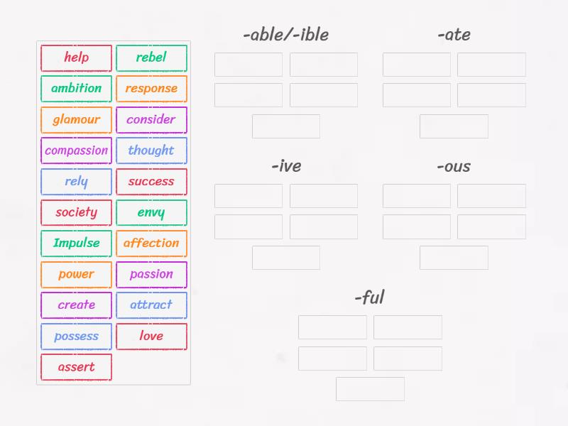 -able/-ible: society, consider, love, rely, response, -ate: passion, affection, compassion, -ive: assert, attract, create, Impulse, possess, -ous: ambition, envy, glamour, rebel, -ful: help, success, thought, power,