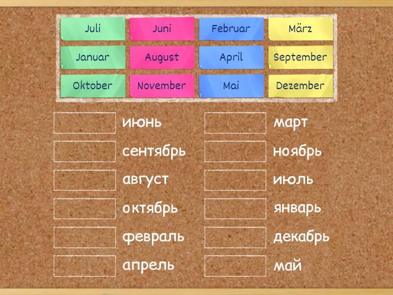 Februar - февраль , März - март , April - апрель , Mai - май , Juni - июнь , August - август , Juli - июль , September - сентябрь , Dezember  - декабрь , November - ноябрь , Januar - январь , Oktober - октябрь ,