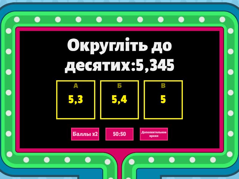 1) Округліть до десятих:5,345 a) 5,3 b) 5,4 c) 5 2) Округліть до десятих: 12,56 a) 12,5 b) 12,6 c) 13 3) Округліть до десятих:9,863 a) 9,9 b) 9,86 c) 10 4) Округліть до сотих:0,032 a) 0,01 b) 0,03 c) 0,04 5) Округліть до сотих:15,6789 a) 15,678 b) 15,68 c) 16,68 6) Округліть до сотих:45,56348 a) 45,5634 b) 45,56 c) 46,5 7) Округліть до тисячних:36,12345 a) 36,123 b) 37,1 c) 36,124 8) Округліть до тисячних:43,156709 a) 43,157 b) 44,157 c) 43,156 9) Округліть до одиниць:123,123 a) 123,1 b) 123 c) 124 10) Округліть до одиниць: 245,567 a) 246 b) 245 c) 245,5 11) Округліть до одиниць:5674,234 a) 5675 b) 5674 c) 5674,2 12) Округліть до десятих:456,678 a) 456,6 b) 457,7 c) 456,7