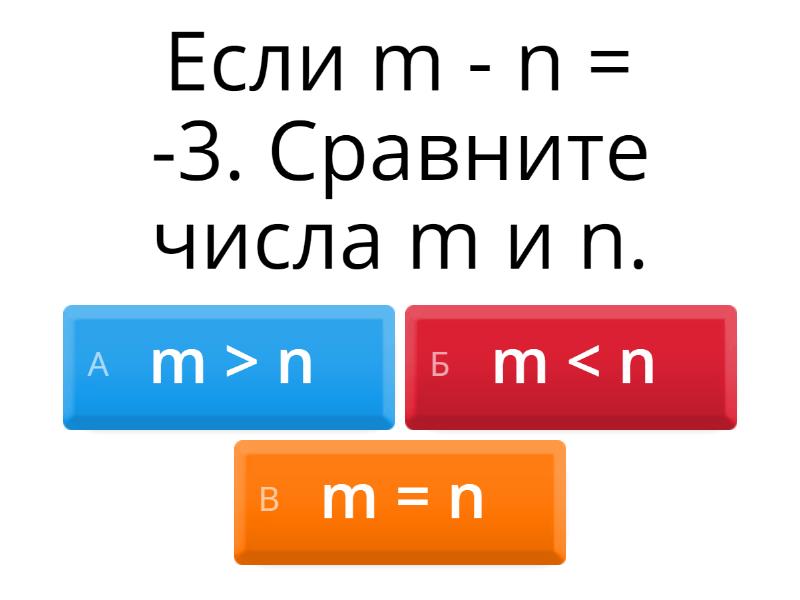 1) Если m - n = -3. Сравните числа m и n. a) m > n b) m < n c) m = n 2) Если a > b, выберите верное неравенство. a) 3a < 3b b) -3a < - 3b c) 8a > 8b d) a - 4 < b - 4 e) a + 10 < b + 10 f) a/2 > b/2 3) Если 2 < x < -3, -1 < y < -7. Оцените выражение х + у. a) 3 < х + у < 10 b) 3 < х + у < 4 c) 1 < х + у < -10 d) -1 < х + у < 4 4) Стороны треугольника а, b, c таковы, что 3 < a < 5, 2 < b < 4, 4 < c < 6. Оцените периметр треугольника. a) 9 < P < 15 b) 24 < P < 120 c) 5 < P < 9 5) Стороны прямоугольника а, b, таковы, что 3 < a < 5, 2 < b < 3. Оцените площадь прямоугольника. a) 5 < S < 8 b) 1 < S < 2 c) 6 < S < 15