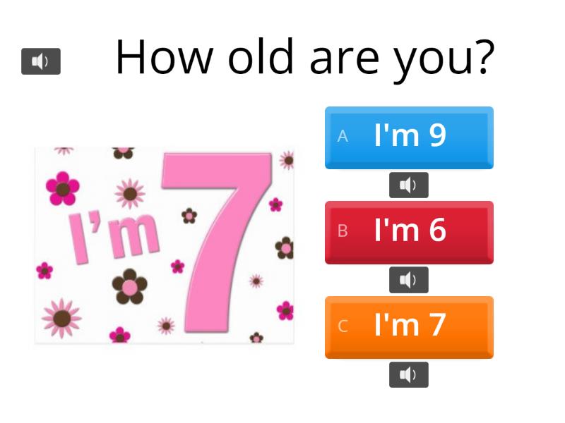 1) How old are you? a) I'm 9 b) I'm 6 c) I'm 7 2) How old is she? a) She is 3 b) She is 7 c) She is 9 3) How old is he? a) He is 1 b) He is 8 c) He is 9 4) How old is a sister? a) She is 2 b) She is 4 c) She is 9 5) How old is a brother? a) He is 8 b) He is 5 c) He is 7 6) How old is a friend? a) She is 10 b) She is 2 c) She is 5 7) How old is a dog? a) It is 1 b) It is 2 c) It is 3 8) How old is a cat? a) It is 1 b) It is 4 c) It is 8 9) How old is a parrot? a) It is 3 b) It is 2 c) It is 8