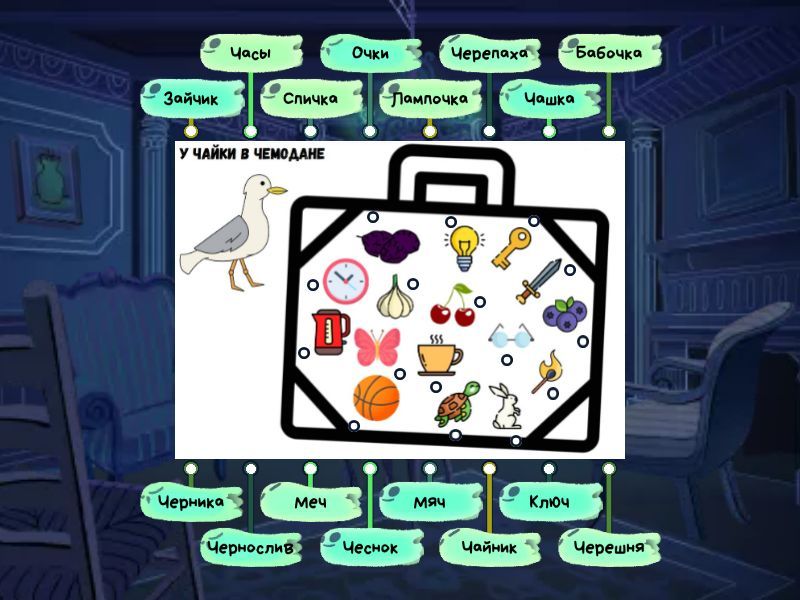 Часы, Чернослив, Чайник, Мяч, Бабочка, Чашка, Черепаха, Зайчик, Спичка, Черника, Меч, Ключ, Лампочка, Очки, Черешня, Чеснок.