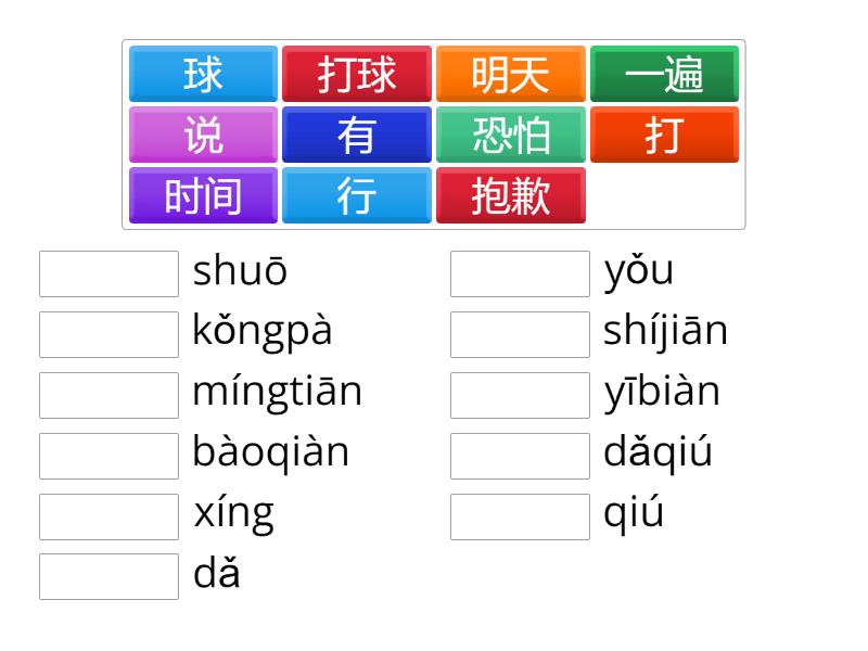 明天 - míngtiān, 有 - yǒu , 时间 - shíjiān, 说 - shuō , 一遍 - yībiàn, 打球 - dǎqiú, 打 - dǎ, 球 - qiú, 抱歉 - bàoqiàn, 恐怕 - kǒngpà , 行 - xíng,