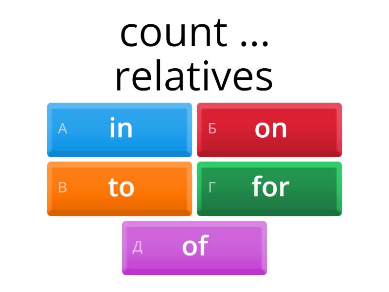 1) count ... relatives a) in b) on c) to d) for e) of 2) dress ... as a princess a) away b) off c) up d) for e) to 3) try ... a new dress in a shop a) in b) on c) up d) for e) to 4) put ... a coat = start wearing a) in b) on c) up d) for e) to 5) take ... a coat = stopwearing a) out b) away c) down d) for e) off 6) go ... = be upset a) away b) off c) down d) for e) to 7) keep myself ... myself a) away b) off c) down d) for e) to 8) look ... on school years (противоп. look ahead) a) away b) off c) down d) back e) to 9) look ... keys = search a) up to b) at c) for d) back e) ahead 10) look ... to my parents = respect a) up b) at c) for d) back e) ahead 11) rub ... on our children a) up b) off c) for d) back e) ahead 12) stand ... - выделяться a) up b) off c) out d) back e) ahead 13) stand up ... myself a) on b) about c) out d) for e) to 14) take ... my dad in appearance a) off b) down c) away d) up e) after 15) talk ... to parents = be rude a) off b) away c) back d) down e) up 16) get ... a message to the public a) off b) away c) back d) across e) up 17) get ... / along with relatives a) in b) on c) to d) for e) up 18) get ... with punishment a) off b) up c) away d) on e) out 19) get ... home = return a) back b) up c) away d) on e) out 20) get ... the airport = arrive at a) for b) up c) away d) to e) in 21) get ... early a) for b) up c) away d) to e) in 22) look perfect / ideal ... the jeans a) about b) to c) by d) for e) with 23) blame the man ... the robbery a) about b) on c) by d) with e) for 24) blame the robbery ... the man a) about b) on c) by d) with e) for 25) care ... children a) about b) of c) by d) with e) on 26) fall ... love with Jack a) about b) of c) by d) in e) on 27) combined work and / ... study a) about b) with c) by d) in e) on 28) come ... an agreement a) to b) with c) by d) in e) on 29) pick ... the boys придираться a) to b) with c) by d) in e) on 30) play ... rules a) to b) with c) by d) in e) on 31) see eye ... eye a) to b) at c) by d) in e) on 32) give ... free tickets a) up b) at c) down d) off e) out 33) hang ... with friends a) up b) at c) down d) off e) out 34) look forward ... the prom a) up b) at c) to d) on e) in 35) pick ... children a) up b) at c) to d) on e) in 36) set ... a project / a company / business a) up b) out c) down d) on e) in 37) sort ... problems a) up b) out c) down d) on e) in 38) try ... new equipment a) up b) out c) down d) on e) in 39) take anger out ... friends a) in b) on c) to d) at e) for 40) get ... the exams = succeed in a) off b) away c) through d) up e) down