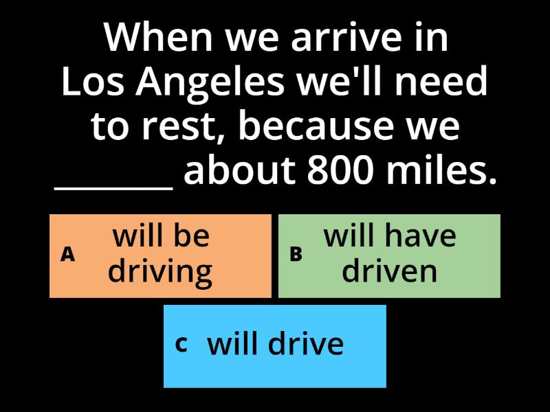 1) When we arrive in Los Angeles we'll need to rest, because we _______ about 800 miles. a) will be driving b) will have driven c) will drive 2) By the time you arrive I _______ something spectacular and dinner will be on the table waiting for you. a) will be cooking b) will have cooked c) will cook 3) When you get off the train, we _______ for you on the platform. a) 'll wait b) 'll be waiting c) 'll have waited 4) Please, come at 8. By that time, I ______ my homework and we can go out. a) 'll be finishing b) 'll finish c) 'll have finished 5) I'm sure when you call him, he _______ TV. He's always in front of the TV! a) 'll be watching b) 'll watch c) 'll have watched 6) We are visiting a new city every week. By the end of the summer, we _______ all the most important cities in Europe. a) will visit b) will be visiting c) will have visited 7) In less than 2 years, my grandparents _______ for 50 years. We are going to celebrate it. a) will have been married b) will be married c) will be getting married 8) I'm cleaning the kitchen. By the time you arrive, it _______ spotless. a) will be b) will being c) will have been 9) Ben is on holiday and he is spending his money very quickly. If he continues like this, he ________ all his money before the end of his holiday. a) will be spending b) will be spent c) will have spent
