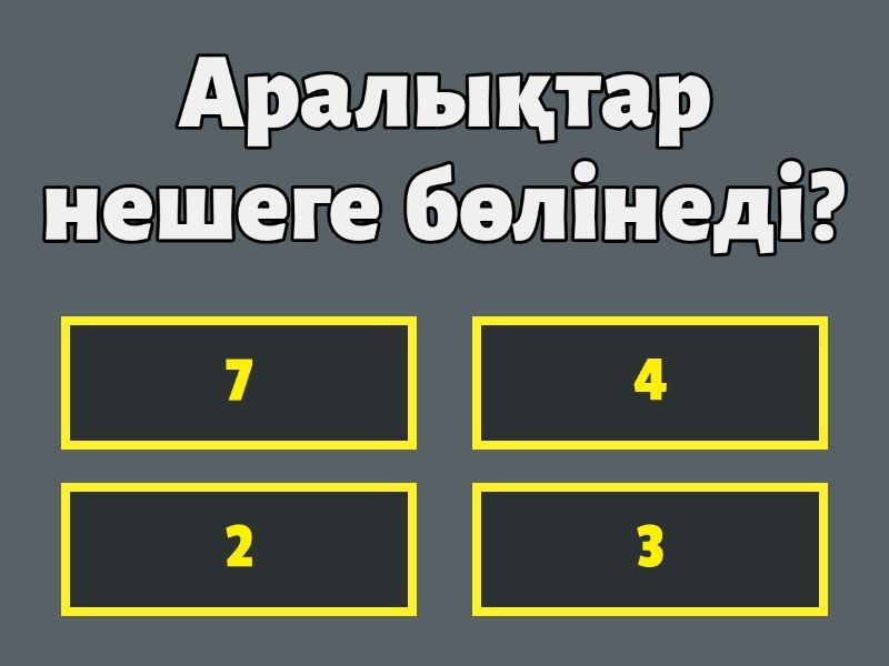 1) Аралықтар нешеге бөлінеді? a) 3 b) 4 c) 2 d) 7 2) Консонанс аралықтарының дыбысы құлаққа қалай естіледі? a) жағымсыз b) жағымды c) пиано d) форте 3) Диссонанс аралықтарының дыбысы құлаққа қалай естіледі? a) Жәй b) меццопиано c) жағымды d) жағымсыз 4) Өте тиянақты жетілген консонанс аралықтарын атаймыз? a) m1-m8 b) m4-m8 c) k2-ү2 d) ү3-к3 5) Жетілген консонанс аралықтарын ата? a) ү6-к7 b) к3-ү3 c) m4-m5 d) m1-m8 6) Жетілмеген консонанс аралықтарын ата? a) к2-ү2,к3-ү3 b) к6-ү6,к7-ү7 c) к3-ү3 d) к3-ү3, к6-ү6 7) Диссонанс аралықтарына жататын аралықты ата? a) к2-ү2,к7-ү7 b) к7-ү7 c) к3-ү3-к7-ү7 d) к2-ү2