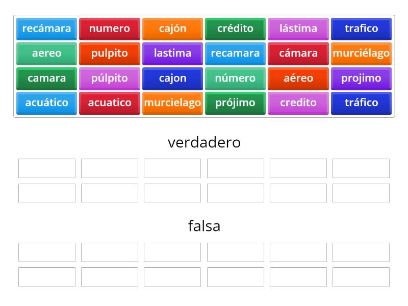 verdadero: tráfico, número, cámara, murciélago, cajón, lástima, prójimo, púlpito, crédito, recámara, acuático, aéreo, falsa : trafico, numero, camara, murcielago, cajon, lastima, projimo, pulpito, credito, recamara, acuatico, aereo,
