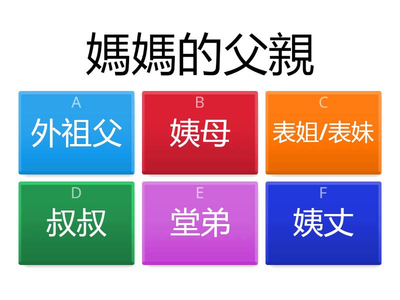 1) 媽媽的父親 a) 外祖父 b) 姨母 c) 表姐/表妹 d) 叔叔 e) 堂弟 f) 姨丈 2) 爸爸的弟弟 a) 姨丈 b) 外祖父 c) 表姐/表妹 d) 叔叔 e) 堂弟 f) 姨母 3) 舅父的女兒 a) 姨母 b) 叔叔 c) 堂弟 d) 外祖父 e) 姨丈 f) 表姐/表妹 4) 媽媽的姐姐或妹妹 a) 表姐/表妹 b) 姨母 c) 堂弟 d) 叔叔 e) 外祖父 f) 姨丈 5) 姨母的丈夫 a) 外祖父 b) 堂弟 c) 姨丈 d) 姨母 e) 表姐/表妹 f) 叔叔 6) 伯父的兒子 a) 表姐/表妹 b) 叔叔 c) 姨母 d) 堂弟 e) 外祖父 f) 姨丈