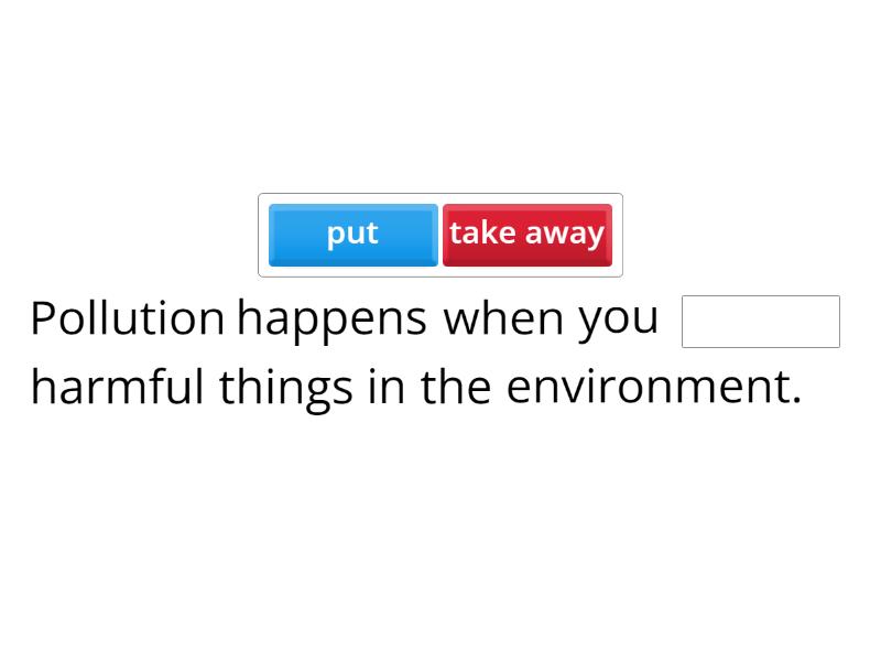 Pollution happens when you ____ harmful things in the environment. A manufacturing factory ____ pollution into the air. A volcanic eruption is a ____ kind of pollution. A car giving off exhaust is a ____ pollutant. A forest fire is a ____ kind of pollution. Smog is ____ in a city. Pollution is ____ to us. Pollution can ____ all living organisms. Breathing polluted air ____ our lungs. Recycling and picking up litter ____ the Earth. When you use less electricity, you ____ pollution on Earth. When you use less fuel in cars and machines, you ____ air pollution.
