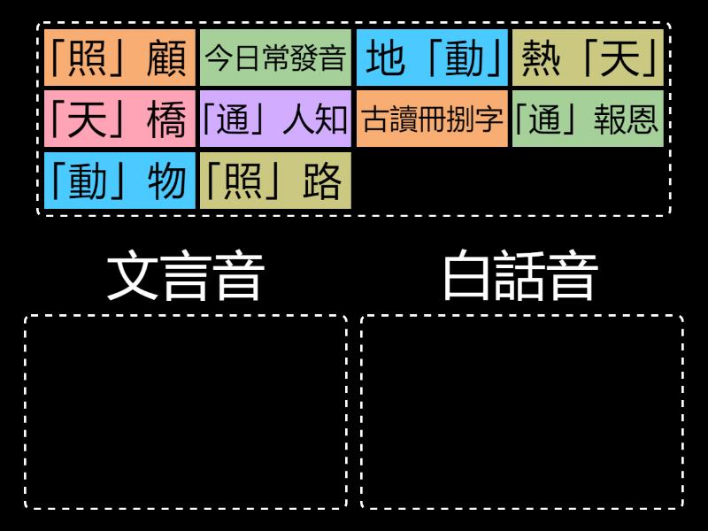 文言音: 「動」物, 「照」顧, 「天」橋, 古讀冊捌字, 「通」人知, 白話音: 地「動」, 「照」路, 熱「天」, 今日常發音, 「通」報恩,