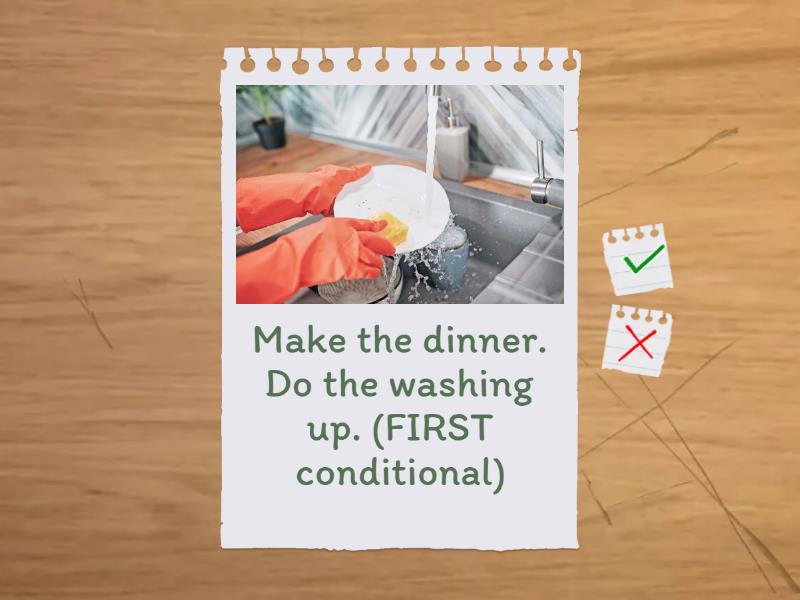 1. You hurt someone's feelings. They are upset. (ZERO conditional), 2. I'm cold at home. I drink hot tea. (ZERO conditional), 3. I don't sleep. I feel tired. (ZERO conditional), 4. You eat a lot of chocolate. You have toothache. (ZERO conditional), The weather is fine. I go to the park. (ZERO conditional), Make the dinner. Do the washing up. (FIRST conditional), Finish work on time. Go to the cinema. (FIRST conditional), Go to Australia. Take photos of Kangaroos. (FIRST conditional), Be hungry tomorrow. Make a cake. (FIRST conditional), Rain tomorrow. Take an umbrella. (FIRST conditional),