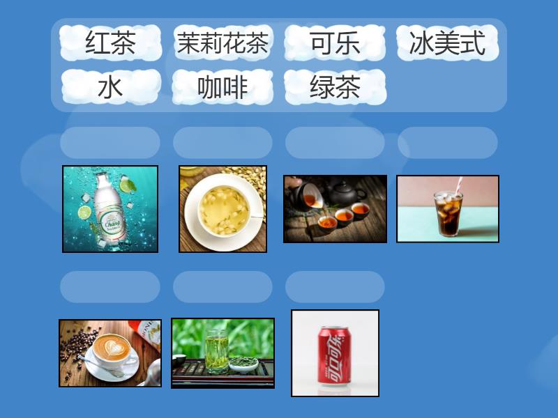 绿茶, 红茶, 茉莉花茶, 咖啡, 可乐, 水, 冰美式,