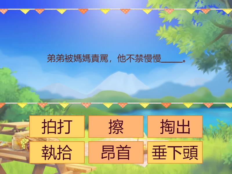 垂下頭 - 弟弟被媽媽責罵,他不禁慢慢_____。, 昂首 - 從他的_____闊步,看得出他此刻充滿自信。, 執拾 - 媽媽快回來了,弟弟立即_____他的房間。, 擦 - 值日生的任務,就是幫助老師_____黑板。, 拍打 - 弟弟生氣時不斷_____桌面,發出巨大的聲音。, 掏出 - 哥哥說他請我吃魚蛋,所以他在口袋_____金錢。,