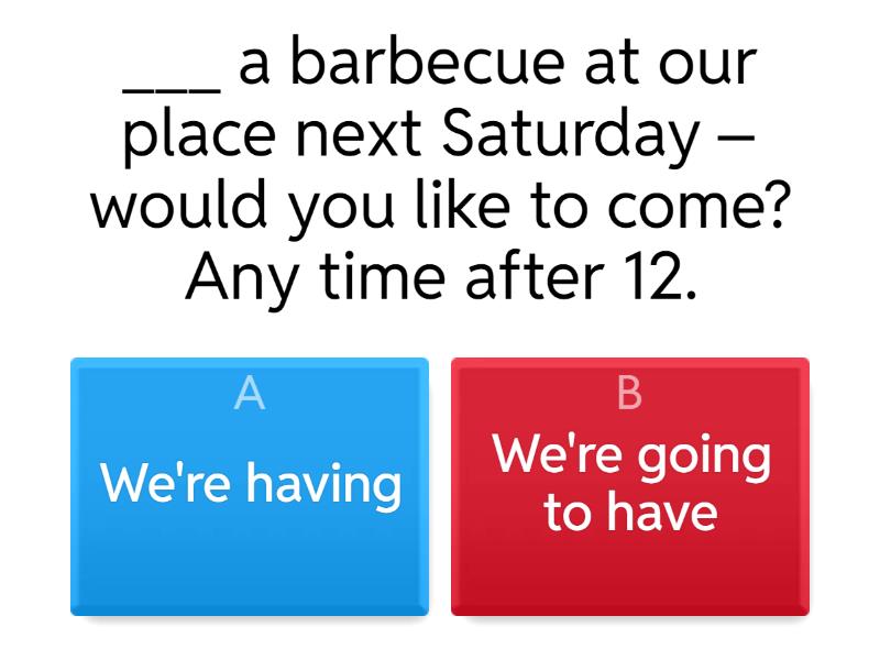 1) ___ out to visit my parents next month – we’ve finally bought the tickets! a) I’m flying b) I'm going to fly 2) Can we arrange a meeting about the project? B: Sure, ___ at a conference on Monday but I’m free for the rest of the week. a) I’m speaking b) I’m going to speak 3) ___ a barbecue at our place next Saturday – would you like to come? Any time after 12. a) We're having b) We're going to have 4) Sorry, can’t make it - ___ dinner with friends on Sunday. a) I’m having b) I’m going to have 5) ___ on Thursday from 9.30-2.30 but I could meet you at 3.30, if that suits. a) I’m teaching b) I’m going to teach 6) ___ the 9pm train home tonight, so I won’t be back until after 10 pm. a) I'm catching b) I'm going to catch 7) ___ my parents sometime next year, if I can get leave from work. a) I’m visiting b) I’m going to visit 8) One day, ___ my colleague I don’t like the way she gossips about the others. a) I’m telling b) I’m going to tell 9) Don't worry, ___ you back for lunch soon. a) I'm paying b) I'm going to pay 10) ___ a novel one day, even if it takes years. a) I'm writing b) I'm going to write 11) ___ my mum a surprise sometime later tonight and call her to catch up.  a) I'm giving b) I'm going to give 12) ___ the kitchen when we’ve saved up the money. a) We're renovating b) We're going to renovate 13) What are you ____ tomorrow? I'd love to catch up for a coffee. a) doing b) going to do 14) What are you ____ when you retire? Any thoughts? a) do b) going to do
