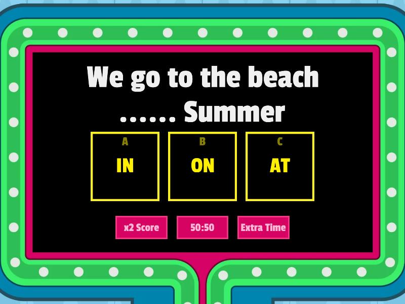 1) We go to the beach ...... Summer a) IN b) ON c) AT 2) My birthday is ...... January a) IN b) ON c) AT 3) Holidays begin ...... Saturday, July 18th a) IN b) ON c) AT 4) What time does the Racing-Boca match start? a) IN b) ON c) AT 5) The party is ...... the 12th of March a) IN b) ON c) AT 6) I was born in 1956.  a) IN b) ON c) AT 7) Do you wear formal clothes ....... Christmas? a) IN b) ON c) AT 8) I usually stay in ........ the weekend. a) IN b) ON c) AT 9) She doesn't get up early .......the morning. a) IN b) ON c) AT 10) I go home ....... lunch time. a) IN b) ON c) AT