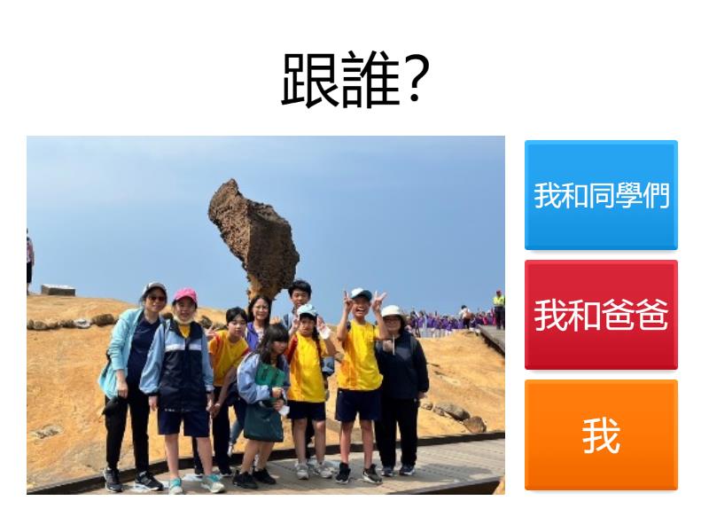 1) 跟誰? a) 我和同學們 b) 我和爸爸 c) 我 2) 去哪裡? a) 實踐國中 b) 野柳 c) 科教館 3) 做什麼事? a) 比滾球比賽 b) 搭捷運 c) 校外教學