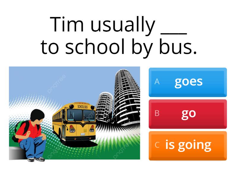 1) Tim usually ___ to school by bus. a) goes b) go c) is going 2)  We ___ lunch now. a) having b) have c) are having 3)  I usually ___ my lunch box to school. a) bring b) bringing c) to bring 4) I ___ my grandma every week. a) visit b) is visiting c) are visiting 5) Kate and Steve ___ tennis on Tuesdays and Fridays. a) play b) are playing c) played 6) It is very hot. The sun ___. a) shines b) is shining c) are shining 7) ___ to school every day? a) Are they walking b) They walk c) Do they walk 8) He ___ his homework! He is playing computer games! a) doesn't do b) isn't doing c) doing 9) My mother ___ coffee every morning. a) drinks b) drink c) is drinking 10) Sally often ___ her bike. a) ride b) is riding c) rides 11) Listen! John ___ the violin. a) plays b) play c) is playing 12) Why is the baby ___? a) cries b) crying c) cry 13) Usually my mother makes dinner. But today my dad ___ his famous pasta for us. a) is cooking b) cook c) cooks 14) Oh look! It ___. We can't go to the park. a) rains b) is raining c) raining 15) What time ___ in the morning? a) do you get up b) are you get up c) you get up 16) How often ___ football? a) you play b) you playing c) do you play 17) A: Where are mom and dad now? B: They ___ to aunt Sarah on the computer. a) are video chatting b) video chat c) video chatting 18) A: Want to play basketball with us? B: Oh no, I can't. I ___ for my English test. a) am study b) am studying c) studying 19) ___ Italian food? a) You like b) Are you liking c) Do you like 20) I cannot talk right now. I ___. a) am working b) work c) working 21) Tom ___ his computer at the moment. His computer ___ every week.   a) fix / break b) is fixing / breaks c) fixes / breaks