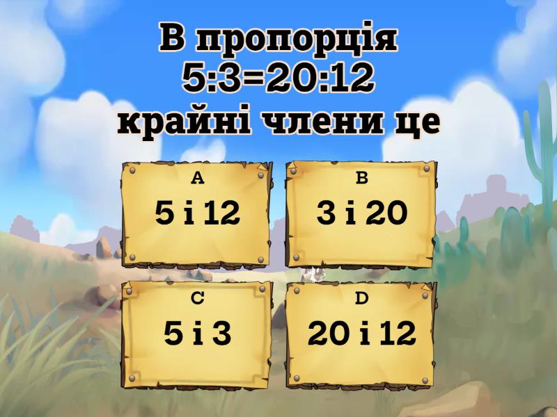 1) В пропорція 5:3=20:12 крайні члени це  a) 5 і 12 b) 3 і 20 c) 5 і 3 d) 20 і 12 2) В пропорція 5:3=20:12 середні члени це a) 5 і 12 b) 3 і 20 c) 5 і 3 d) 20 і 12 3) Чи можна скласти пропорцію з відношень 10:5 і 34:17? a) так b) ні 4) Чи можна скласти пропорцію з відношень 1:7 і 9:63? a) так b) ні 5) Чи можна скласти пропорцію з відношень 4:10 і 15:6? a) так b) ні 6) знайти невідоме 2:х=10:25 a) 5 b) 3 c) 4