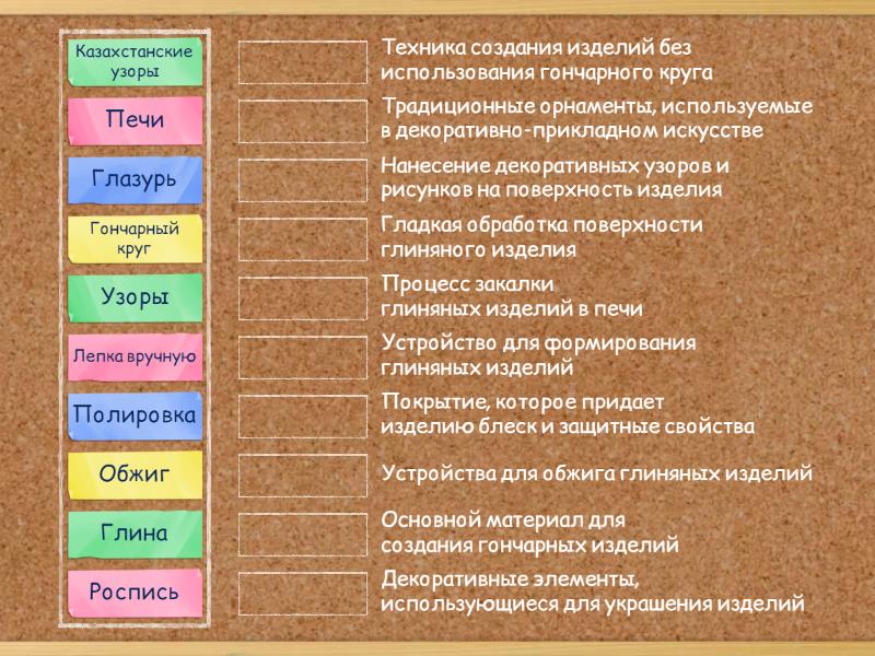 Гончарный круг - Устройство для формирования глиняных изделий, Лепка вручную - Техника создания изделий без использования гончарного круга, Обжиг - Процесс закалки глиняных изделий в печи, Роспись - Нанесение декоративных узоров и рисунков на поверхность изделия, Полировка - Гладкая обработка поверхности глиняного изделия, Глазурь - Покрытие, которое придает изделию блеск и защитные свойства, Глина - Основной материал для создания гончарных изделий, Узоры - Декоративные элементы, использующиеся для украшения изделий, Печи - Устройства для обжига глиняных изделий, Казахстанские узоры - Традиционные орнаменты, используемые в декоративно-прикладном искусстве,