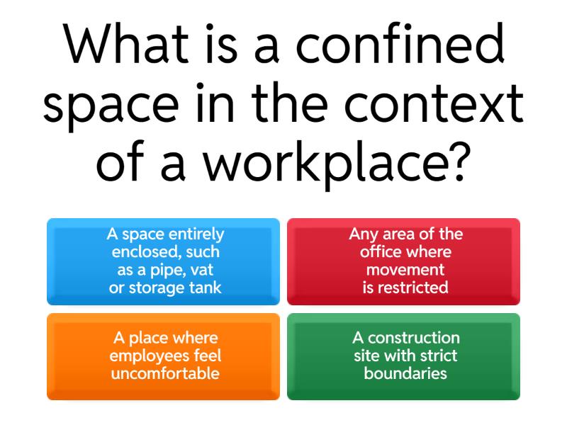 1) What is a confined space in the context of a workplace? a) A space entirely enclosed, such as a pipe, vat or storage tank b) Any area of the office where movement is restricted c) A place where employees feel uncomfortable d) A construction site with strict boundaries 2) What potential risks are associated with working in confined spaces? a) Reduced productivity due to limited movement b) Lack of oxygen, presence of poisonous gas, risk of fires or explosions, and difficulties in access for emergency rescue c) Increased chances of arguments among employees d) Inability to receive mobile signals 3) In terms of safety regulations, who is responsible for ensuring the safety of employees working in confined spaces? a) Employees themselves b) The government c) Neighboring businesses d) The employer or person in control of the work being carried out 4) What actions should be taken before anyone enters a confined space? a) Ensure adequate training and proper equipment are provided, implement necessary safety measures, and have a planned rescue method in case of an emergency b) Inform everyone about the adventure trip c) Send in the least experienced worker first d) Ensure everyone has their personal belongings with them 5) Which of the following is not a safety measure when working in a confined space? a) Use of appropriate personal protective equipment (PPE) b) Effective communication system between the worker inside and the observer outside c) The presence of a standby person ready to respond in case of emergency d) Overloading the space with as many workers as possible to finish the job quicker