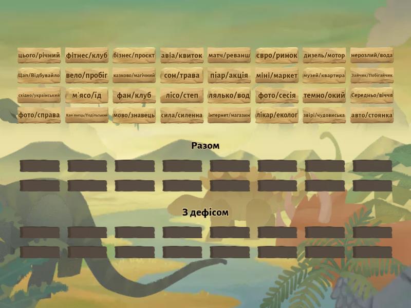 Разом: євро/ринок, лісо/степ, фото/справа, вело/пробіг, лялько/вод, м’ясо/їд, темно/окий, мово/знавець, східно/український, Середньо/віччя, нерозлий/вода, міні/маркет, цього/річний, авіа/квиток, авто/стоянка, фото/сесія, З дефісом: лікар/еколог, Цап/Відбувайло, музей/квартира, фан/клуб, фітнес/клуб, піар/акція, дизель/мотор, бізнес/проєкт, сон/трава, Зайчик/Побігайчик, казково/магічний, інтернет/магазин, матч/реванш, Кам’янець/Подільський, сила/силенна, звірі/чудовиська,