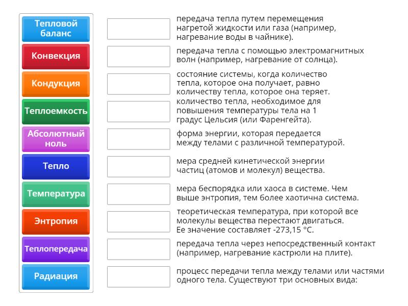 Тепло - форма энергии, которая передается между телами с различной температурой., Температура - мера средней кинетической энергии частиц (атомов и молекул) вещества., Теплоемкость - количество тепла, необходимое для повышения температуры тела на 1 градус Цельсия (или Фаренгейта)., Энтропия - мера беспорядка или хаоса в системе. Чем выше энтропия, тем более хаотична система., Теплопередача - процесс передачи тепла между телами или частями одного тела. Существуют три основных вида:, Кондукция - передача тепла через непосредственный контакт (например, нагревание кастрюли на плите)., Конвекция - передача тепла путем перемещения нагретой жидкости или газа (например, нагревание воды в чайнике)., Радиация - передача тепла с помощью электромагнитных волн (например, нагревание от солнца)., Тепловой баланс - состояние системы, когда количество тепла, которое она получает, равно количеству тепла, которое она теряет., Абсолютный ноль - теоретическая температура, при которой все молекулы вещества перестают двигаться. Ее значение составляет -273,15 °C.,