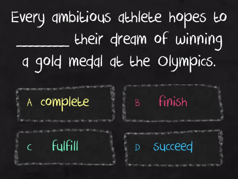 1) Every ambitious athlete hopes to ________ their dream of winning a gold medal at the Olympics. a) complete b) finish c) fulfill d) succeed 2) A team of psychologists recently _______ some research on the emotional responses of those finishing second. a) controlled b) conducted c) directed d) guided 3) For certain individuals, a silver medal may ________ their expectations and so naturally they will be delighted. a) exceed b) overtake c) pass d) overcome 4) They may also enjoy surprising experts and journalists who believed they had absolutely no _________ of achieving anything. a) outlook b) view c) estimate d) prospect 5) In ____________, the athlete who everyone assumed would win with ease, but then suffers a defeat, may not celebrate their silver medal. a) opposition b) contrast c) distinction d) contradiction 6) In contrast, the athlete who everyone assumed would win with ease, but then suffers a ___________ defeat, may not celebrate their silver medal. a) thin b) tight c) narrow d) slight 7) This reaction differs ___________ from the athlete who comes second but finished a long way behind the winner. a) sharply b) strongly c) pointedly d) heavily 8) There is a ________ in the research that shows such a person will feel significantly happier. a) habit b) trend c) custom d) tendency 9) To a certain ___________, these findings are not surprising. a) extent b) amount c) range d) level 10) Silver medallists who were close to victory will almost certainly ____________ on what might have happened it they had trained harder. a) review b) wonder c) consider d) reflect