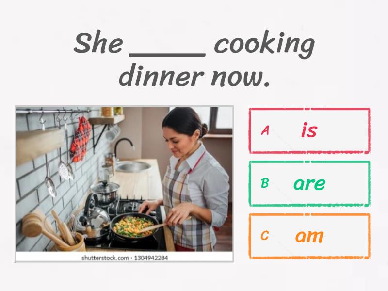 1) She _____ cooking dinner now. a) is b) are c) am 2) ______ you watching TV? a) Is b) Am c) Are 3) Is she doing her homework now? a) Yes, she is. b) No, she aren't. c) Yes, she does. 4) My friends _____ talking at the moment. a) are b) is c) am 5) I am ___________ the Internet now. a) surfing b) surf c) sending 6) We _____ looking for our keys. a) am b) are c) is 7) - What ____ your mum doing? - She is working. a) is b) am c) are 8) I am __________  my hair. a) cut b) cuting c) cutting 9) The cat _____ sleeping now. a) is b) am c) are 10) What ____ she looking at? a) is b) are c) am 11) I ____ listening to my favourite song now. a) is b) am c) are 12) Our classmates ____ playing football at the moment. a) are b) is c) am