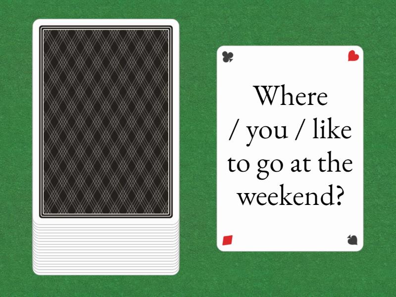 : How often / you / watch TV?, What TV shows / you / watch / now?, What / you/ do in your free time?, What / you / do/ after class?, Who / you / live/ with?, Where / you / live/ at the moment?, What sports / you/ like to play?, you / play / any sports this week?, How often / you/ study English?, you / study/ anything else at the moment?, you / usually feel cheerful?, How / you / feel / today?, What / you/ usually wear to a party?, What / you/ wear/ now?, What / you/ usually do with your friends?, You/ meet/ any friends today?, Where / you / like to go at the weekend?, Where/ you / go / this weekend?, What/ you/ spend most of your money on?, You/ save/ for anything at the moment?,