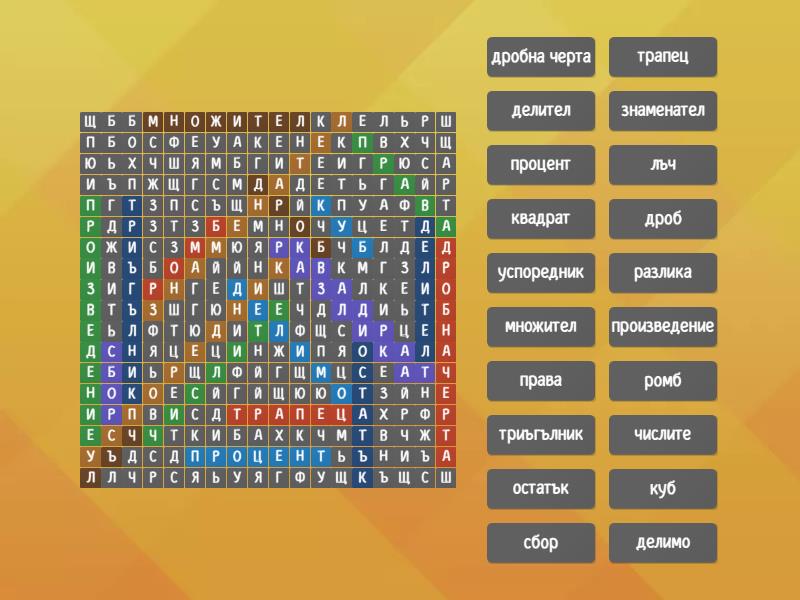 числите - числите, сбор - сбор, трапец - трапец, куб - куб, дроб - дроб, остатък  - остатък, успоредник - успоредник, произведение - произведение, квадрат - квадрат, ромб - ромб, делимо - делимо, множител - множител, триъгълник - триъгълник, знаменател - знаменател, права - права, разлика - разлика, дробна черта - дробна черта, процент - процент, лъч - лъч, делител - делител,