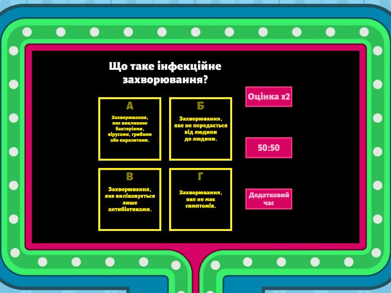 1) Що таке інфекційне захворювання? a) Захворювання, яке викликане бактеріями, вірусами, грибами або паразитами. b) Захворювання, яке не передається від людини до людини. c) Захворювання, яке виліковується лише антибіотиками. d) Захворювання, яке не має симптомів. 2) Яким шляхом найчастіше передаються інфекційні захворювання? a) Через повітря. b) Через контакт з зараженою кров'ю або іншими біологічними рідинами. c) Через їжу та воду. d) Через укуси комах. e) Всі перераховані вище. 3) Які симптоми можуть спостерігатися при інфекційних захворюваннях? a) Лихоманка, втома, біль у м'язах, головний біль. b) Висип, свербіж, діарея, блювота. c) Кашель, нежить. d) Всі перераховані вище. 4) Які існують методи профілактики інфекційних захворювань? a) Щоб не хворіти, потрібно пити багато води. b) Щоб не хворіти, потрібно їсти багато овочів і фруктів. c) Щоб не хворіти, потрібно робити щеплення. d) Щоб не хворіти, потрібно дотримуватися правил особистої гігієни. e) Всі перераховані вище. 5) Яке захворювання НЕ належить до інфекційних? a) Грип. b) Виразка шлунка. c) СНІД. 6) Як передається ВІЛ/СНІД? a) Через повітря. b) Через контакт з зараженою кров'ю або іншими біологічними рідинами. c) Через їжу та воду. d) Через укуси комах. 7) Що таке туберкульоз? a) Інфекційне захворювання, яке вражає легені. b) Захворювання, яке не передається від людини до людини. c) Захворювання, яке виліковується лише антибіотиками. d) Захворювання, яке не має симптомів. 8) Як передається туберкульоз? a) Через повітря, коли хвора людина кашляє або чхає. b) Через контакт з зараженою кров'ю або іншими біологічними рідинами. c) Через їжу та воду. d) Через укуси комах. 9) Назвіть симптоми туберкульозу? a) Тривалий кашель, кровохаркання, втрата ваги, втома. b) Висип, свербіж, діарея, блювота. c) Кашель, 10) Що робити, якщо ви думаєте, що у вас може бути інфекційне захворювання? a) Негайно зверніться до лікаря. b) Проігноруйте симптоми та сподівайтесь, що вони зникнуть самі собою. c) Приймайте антибіотики без рецепта. d) Зверніться до друга або члена сім'ї за порадою.