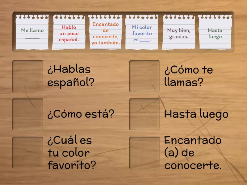 Me llamo ______ - ¿Cómo te llamas?, Encantado de conocerte, yo también. - Encantado (a) de conocerte., Muy bien, gracias. - ¿Cómo está?, Hablo un poco español. - ¿Hablas español? , Mi color favorito es ____. - ¿Cuál es tu color favorito?, Hasta luego - Hasta luego,