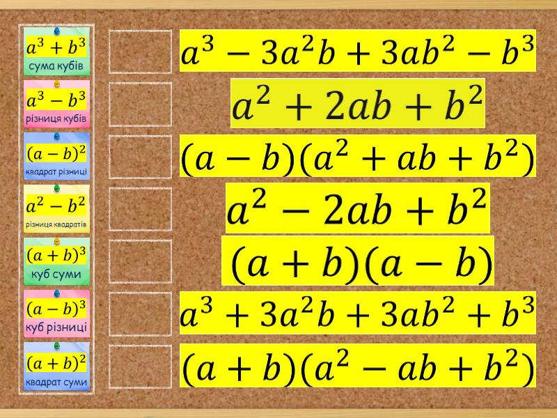 квадрат суми, сума кубів, куб різниці, різниця кубів, квадрат різниці, різниця квадратів, куб суми,