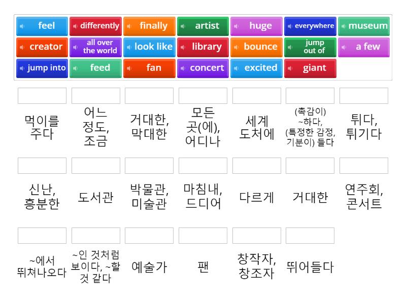 a few - 어느 정도, 조금, all over the world - 세계 도처에, artist - 예술가, bounce - 튀다, 튀기다, concert - 연주회, 콘서트, creator - 창작자, 창조자, differently - 다르게, everywhere - 모든 곳(에), 어디나, excited - 신난, 흥분한, fan - 팬, feed - 먹이를 주다, feel - (촉감이) ~하다, (특정한 감정, 기분이) 들다, finally - 마침내, 드디어, giant - 거대한, huge - 거대한, 막대한, jump into - 뛰어들다, jump out of - ~에서 뛰쳐나오다, library - 도서관, look like - ~인 것처럼 보이다, ~할 것 같다, museum - 박물관, 미술관,
