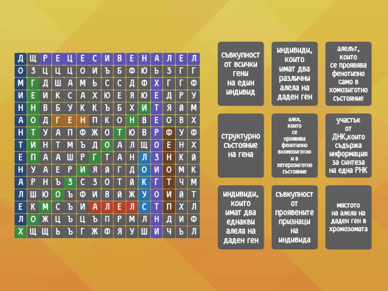 хомозиготни - индивиди, които имат два еднакви алела на даден ген, хетерозиготни - индивиди, които имат два различни алела на даден ген, алел - структурно състояние на гена, локус - мястото на алела на даден ген в хромозомата, фенотип - съвкупност от проявените признаци на индивида, доминантен алел - алел, които се проявява фенотипно вхомозиготно и в хетерозиготно състояние, ген - участък от ДНК,които съдържа информация за синтеза на една РНК, генотип - съвкупност от всички гени на един индивид, рецесивен алел - алелът, които се проявява фенотипно само в хомозиготно състояние,