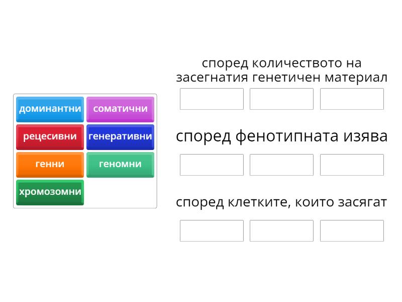 според количеството на засегнатия генетичен материал: генни, хромозомни, геномни, според фенотипната изява: доминантни, рецесивни, според клетките, които засягат: соматични, генеративни,