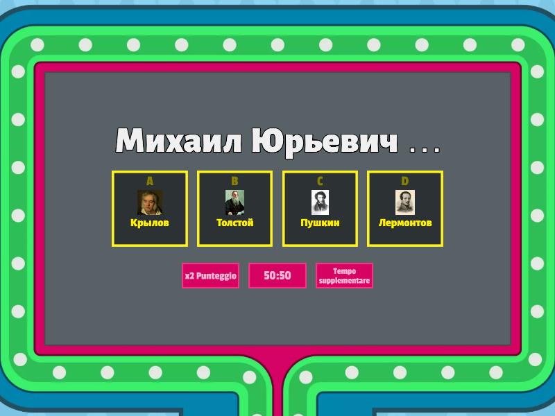 1) Михаил Юрьевич … a) Крылов b) Толстой c) Пушкин d) Лермонтов 2) Александр Сергеевич … a) Крылов b) Толстой c) Пушкин d) Лермонтов 3) Лев Николаевич … a) Крылов b) Толстой c) Пушкин d) Лермонтов 4) Иван Андреевич … a) Крылов b) Толстой c) Пушкин d) Лермонтов 5) Кто из писателей провел свое детство в имении Ясная Поляна? a) Крылов b) Толстой c) Пушкин d) Лермонтов 6) Кто из писателей погиб на дуэли с Дантесом? a) Крылов b) Толстой c) Пушкин d) Лермонтов 7) Кто из писателей написал «Зимнее утро»? a) Крылов b) Толстой c) Пушкин d) Лермонтов 8) Кто из писателей написал «Ворона и лисица»? a) Крылов b) Толстой c) Пушкин d) Лермонтов 9) Кто из писателей написал «Зимний вечер»? a) Крылов b) Толстой c) Пушкин d) Лермонтов 10) Кто из писателей написал «Прыжок»? a) Крылов b) Толстой c) Пушкин d) Лермонтов 11) Кто из писателей написал «Сказку о царе Салтане»? a) Крылов b) Толстой c) Пушкин d) Лермонтов 12) Кто из писателей написал «На севере диком»? a) Крылов b) Толстой c) Пушкин d) Лермонтов 13) Кто из писателей написал «Утес»? a) Крылов b) Толстой c) Пушкин d) Лермонтов 14) Кто из писателей написал «Мартышка и очки»? a) Крылов b) Толстой c) Пушкин d) Лермонтов 15) Кто из писателей написал «Горные вершины»? a) Крылов b) Толстой c) Пушкин d) Лермонтов 16) Кто из писателей написал «Акула»? a) Крылов b) Толстой c) Пушкин d) Лермонтов 17) У кого из писателей была няня Арина Родионовна? a) Крылов b) Толстой c) Пушкин d) Лермонтов 18) Кто из писателей погиб на дуэли с Мартыновым? a) Крылов b) Толстой c) Пушкин d) Лермонтов 19) Найди эпитет a) ночевала тучка b) сосна дремлет c) на севере диком d) вершины спят 20) Найди олицетворение a) тучка золотая b) ночевала тучка c) старый утес d) влажный след 21) Афанасий Афанасьевич … a) Фет b) Тютчев c) Никитин d) Суриков 22) Иван Захарович … a) Фет b) Тютчев c) Никитин d) Суриков 23) Федор Иванович … a) Фет b) Тютчев c) Никитин d) Суриков 24) Иван Саввич … a) Фет b) Тютчев c) Никитин d) Суриков 25) Найди значение слова «тороватый» a) щедрый b) горбатый c) старый d) скуповатый 26) Найди значение слова «зефиры» a) кондитерские изделия b) теплые ветры c) осенние листья d) путешественники 27) Найди значение слова «смежает» a) закрывает b) радуется c) думает d) смеется