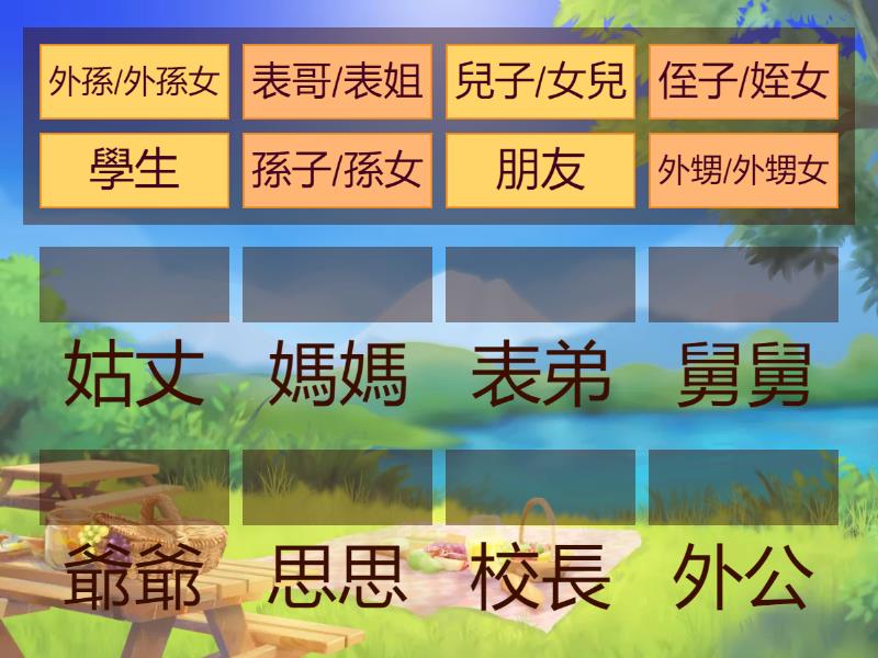 孫子/孫女 - 爺爺, 外甥/外甥女 - 舅舅, 學生 - 校長, 侄子/姪女 - 姑丈, 表哥/表姐 - 表弟, 外孫/外孫女 - 外公, 兒子/女兒 - 媽媽, 朋友 - 思思,