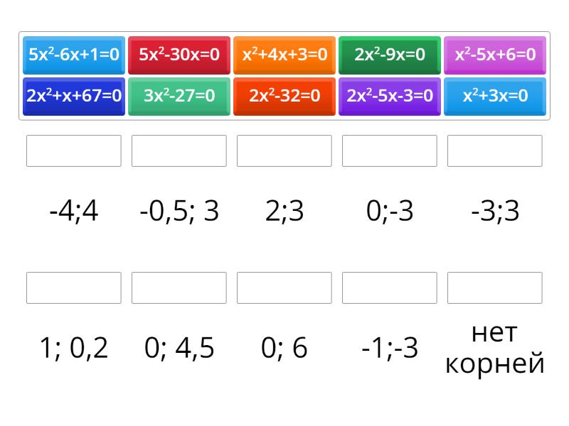 х2-5х+6=0 - 2;3, 2х2-32=0 - -4;4, х2+3х=0 - 0;-3, х2+4х+3=0 - -1;-3, 5х2-6х+1=0 - 1; 0,2, 3х2-27=0 - -3;3, 5х2-30х=0 - 0; 6, 2х2+х+67=0 - нет корней, 2х2-5х-3=0 - -0,5; 3, 2х2-9х=0 - 0; 4,5,