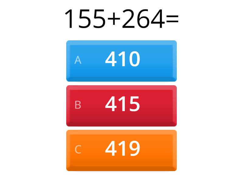 1) 155+264= a) 410 b) 415 c) 419 2) 567 + 87 a) 658 b) 657 c) 654 3) 108+21= a) 129 b) 127 c) 125 4) 454+1= a) 464 b) 455 c) 554 5) 453+333= a) 787 b) 786 c) 785 6) 901+10= a) 911 b) 1101 c) 900 7) 155+456= a) 612 b) 611 c) 610 8) 100+100= a) 1000 b) 200 c) 2000 9) 6 000 000+0= a) 60000000 b) 600000 c) 6000000 10) 75+3= a) 77 b) 78 c) 79