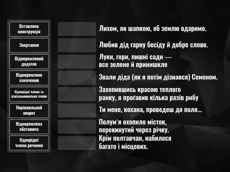 Відокремлене означення - Полум’я охопило місток, перекинутий через річку., Звертання - Ти мене, кохана, проведеш до поля..., Відокремлена обставина - Захопившись красою теплого ранку, я проґавив кілька разів рибу, Однорідні члени речення - Любив дід гарну бесіду й добре слово., Відокремлений додаток - Крім полтавчан, набилося багато і місцевих., Порівняльний зворот - Лихом, як шапкою, об землю вдаримо., Однорідні члени та узагальнювальне слово - Луки, гори, пишні сади — все зелене й принишкле, Вставлена конструкція - Звали діда (як я потім дізнався) Семеном.,