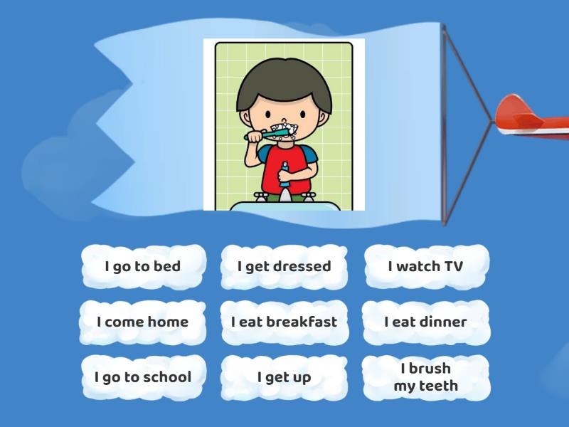 I brush my teeth, I go to school, I get dressed, I eat breakfast, I watch TV, I come home, I eat dinner, I go to bed, I get up,