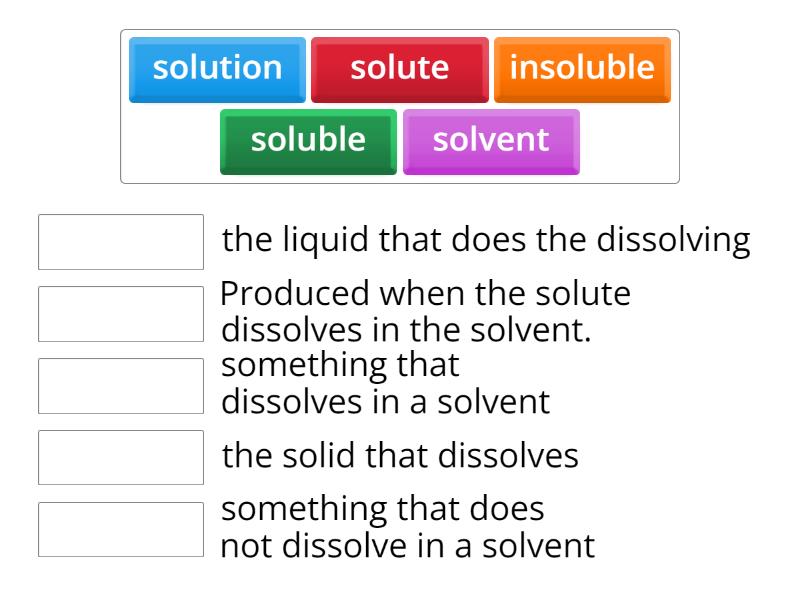 soluble - something that dissolves in a solvent, insoluble - something that does not dissolve in a solvent, solute - the solid that dissolves, solvent - the liquid that does the dissolving, solution - Produced when the solute dissolves in the solvent.,